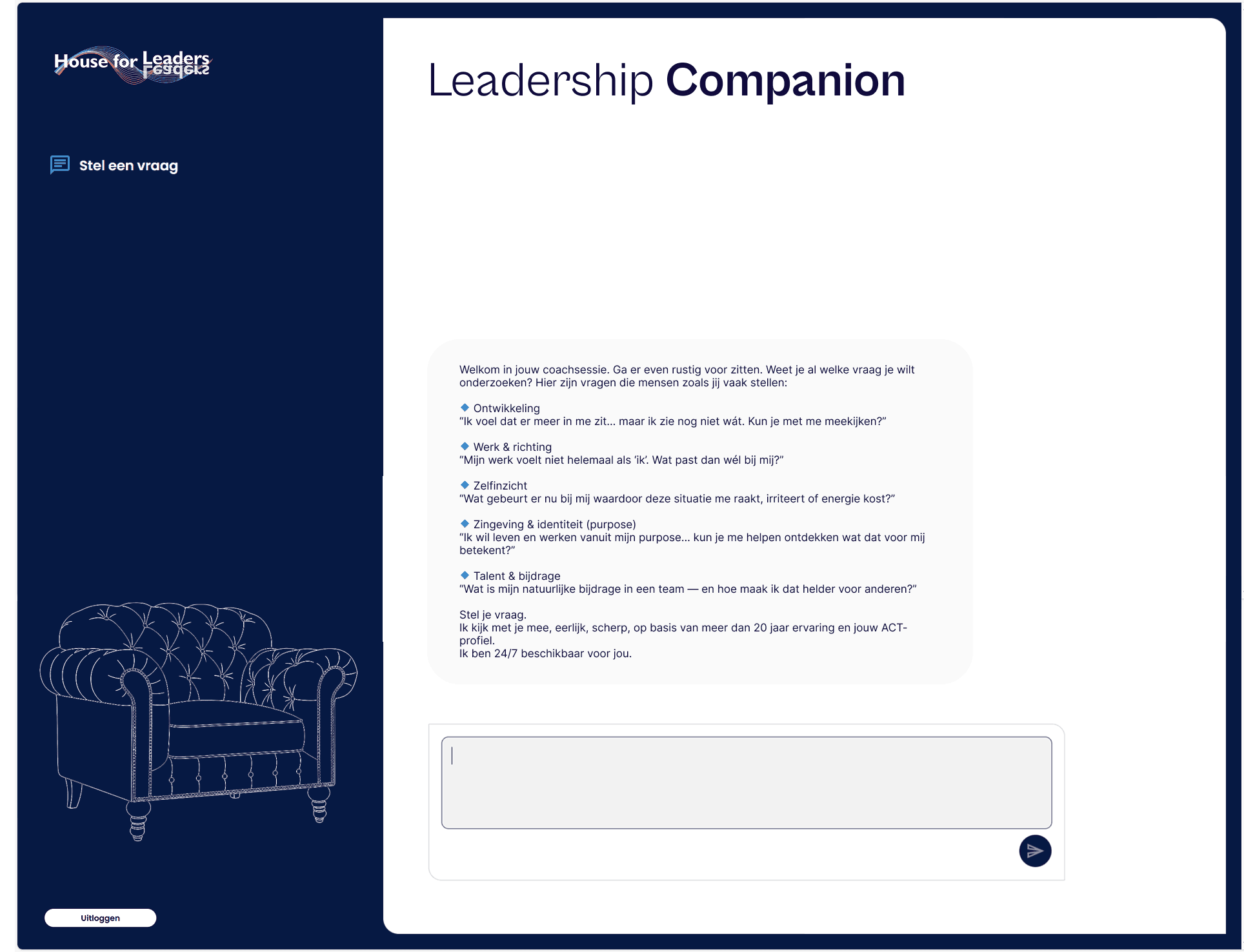 Leadership Companion is onze nieuwe AI-coach. Gebouwd op de kennis, visie en stem van Eduard Baas, de grondlegger van House for Leaders en de ACT®-meting, is het dé digitale compagnon die niet alleen met je praat, maar je snapt.